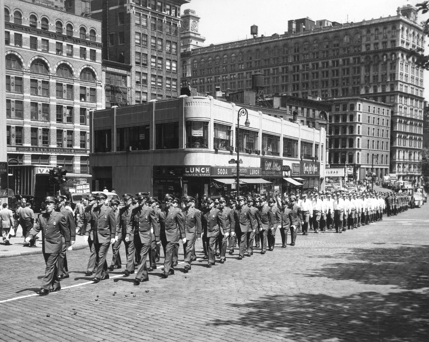 Officers and sanitation workers on parade, 1954. Courtesy of DSNY.